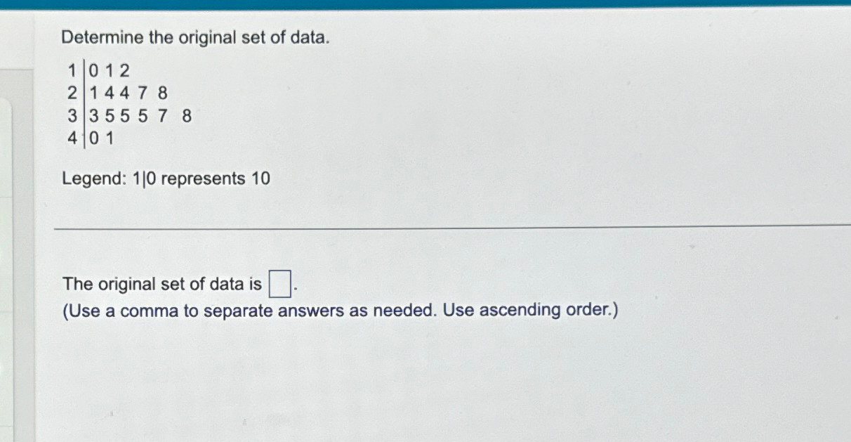 Solved Determine the original set of data. How To Determine Original Set Of Data The original set of data is. Stem and leaf plots are also known as stemplots. The aim of the research. The type of data that you will. before you begin collecting data, you need to consider: understanding the provenance of data helps in ascertaining its reliability and credibility. locating datasets in acm digital library database. about. How To Determine Original Set Of Data.